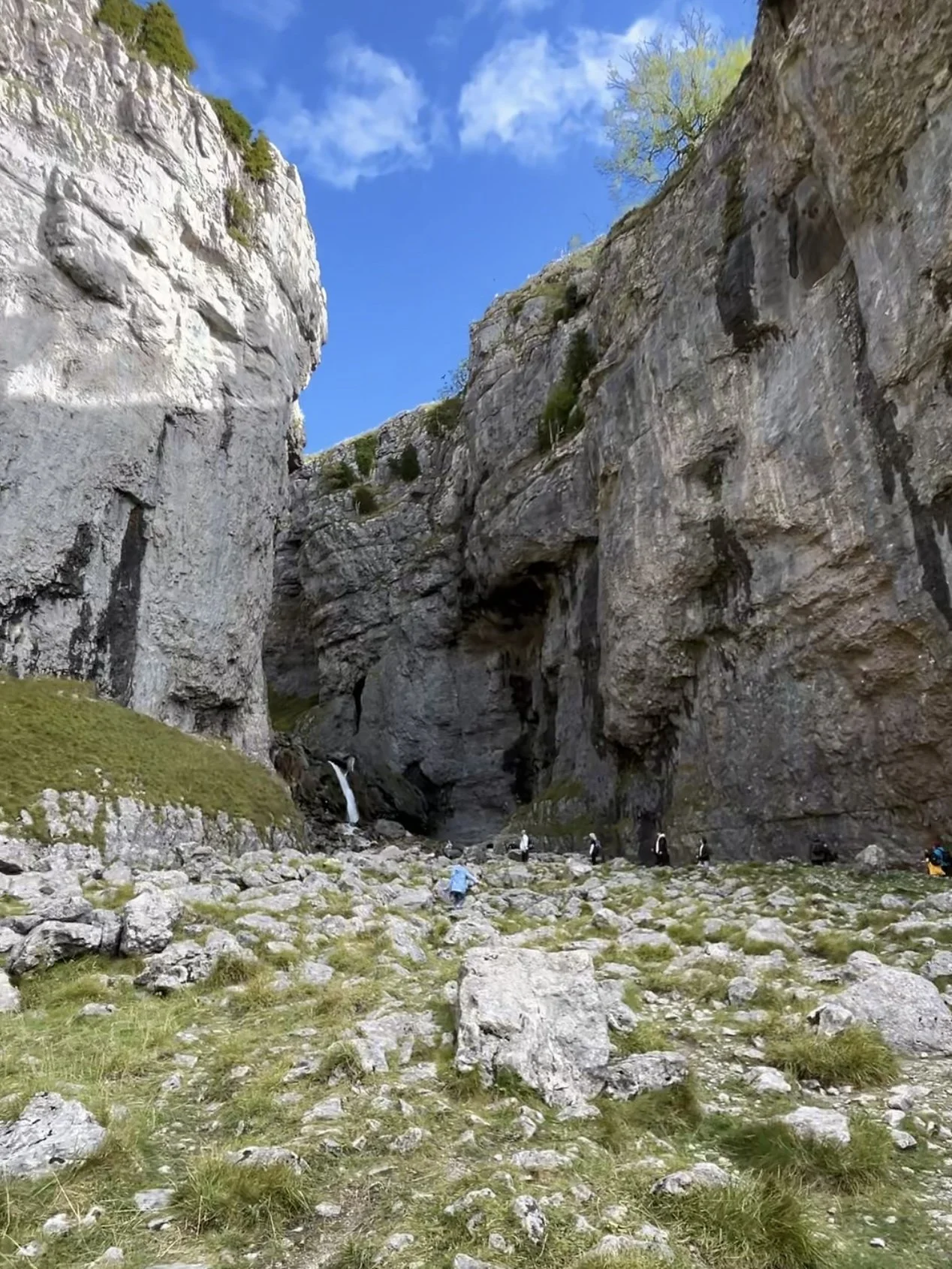Towering limestone cliffs rise on either side of a narrow gorge, with waterfalls cascading through the centre. It’s one of the most dramatic natural features in the Yorkshire Dales and feels wild, rugged, and untouched.